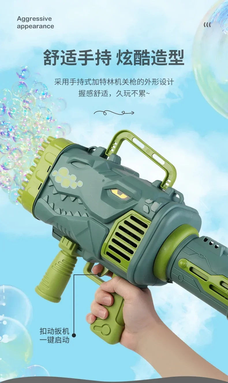 Soprador de bolhas com aparência de dinossauro: O soprador de bolhas pode produzir centenas de bolhas coloridas por minuto, as crianças ficarão atraídas por este brinquedo de dinossauro.Seu design engraçado fará com que se torne um brinquedo popular no verão.